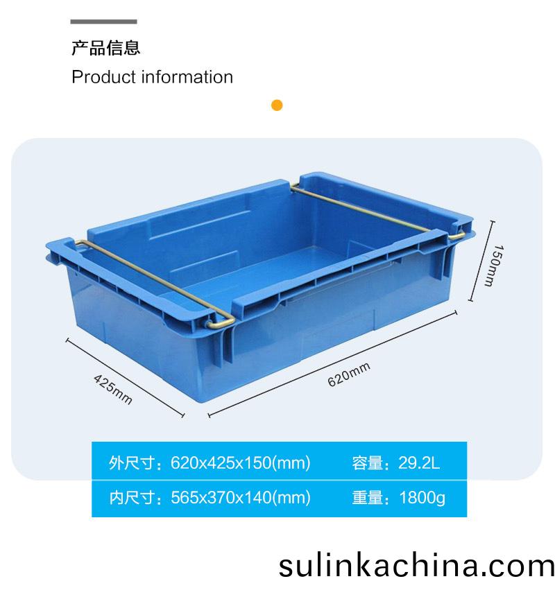 外尺寸:620*425*150mm 內尺寸:565*370*140mm 材質:PP 重量:1800g