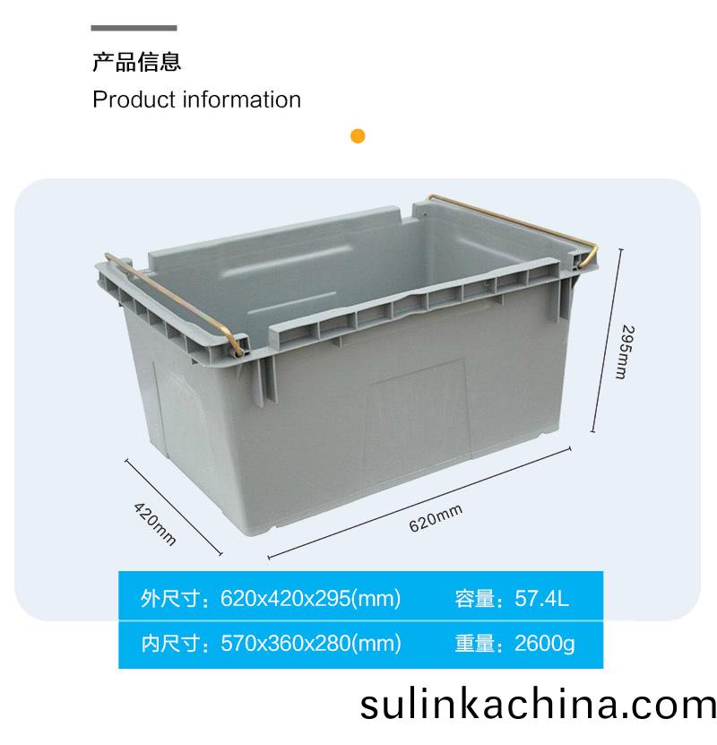 外(wai)尺寸:620*425*295mm 內尺(chi)寸:570*370*280mm 材(cai)質(zhi):PP 重量:2600g