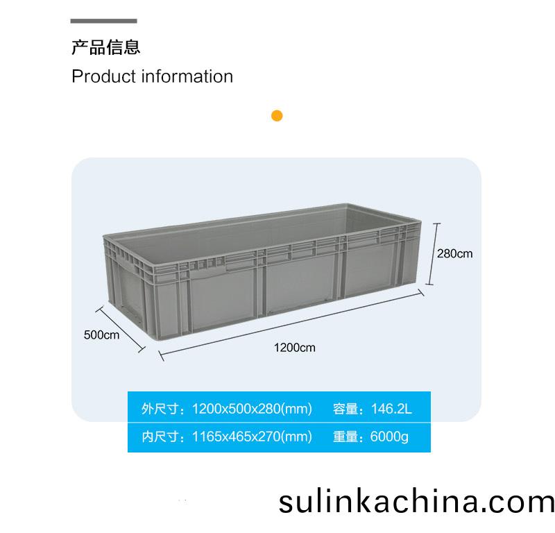 外尺寸:1200*500*280mm 內尺寸:1165*465*270mm 材質:PP 重量:6000g