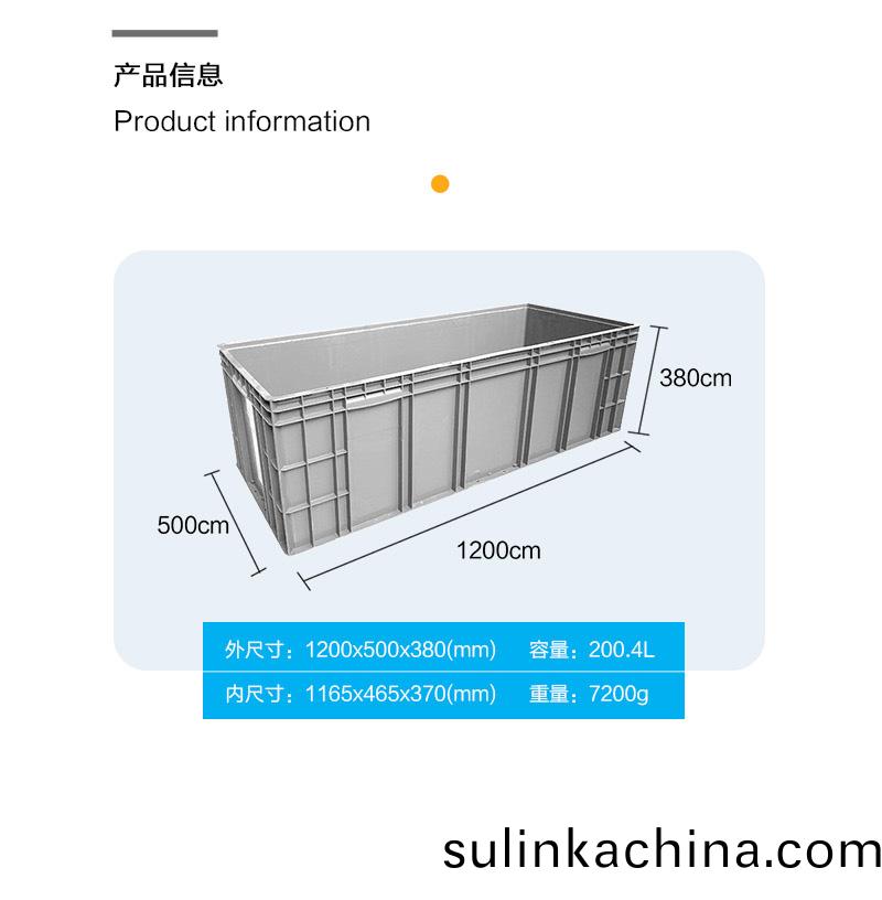 外尺寸:1200*500*380mm 內尺寸(cun):1165*465*370mm 材質:PP 重量:7200g
