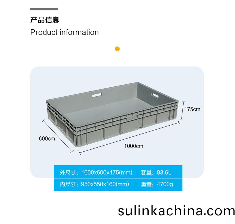 外尺寸:1000*600*175mm 內尺寸:950*550*160 材質:PP 重(zhong)量(liang):4700g