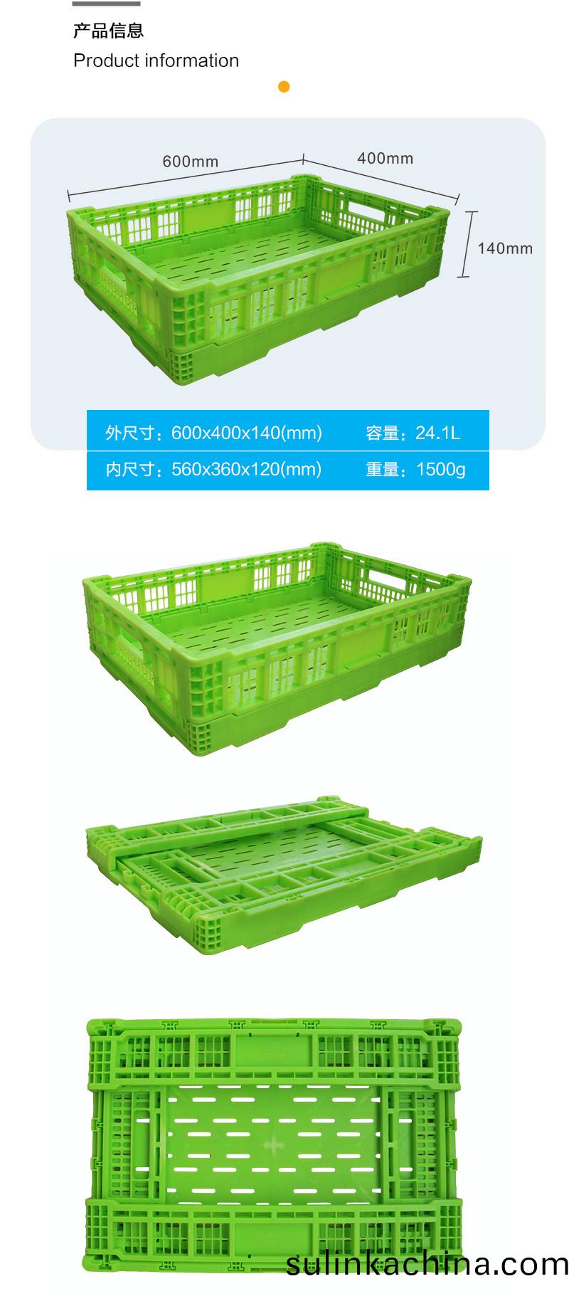 外尺寸:600*400*140mm 內(nei)尺寸:560*360*120mm 材質:PP 重量:1500g