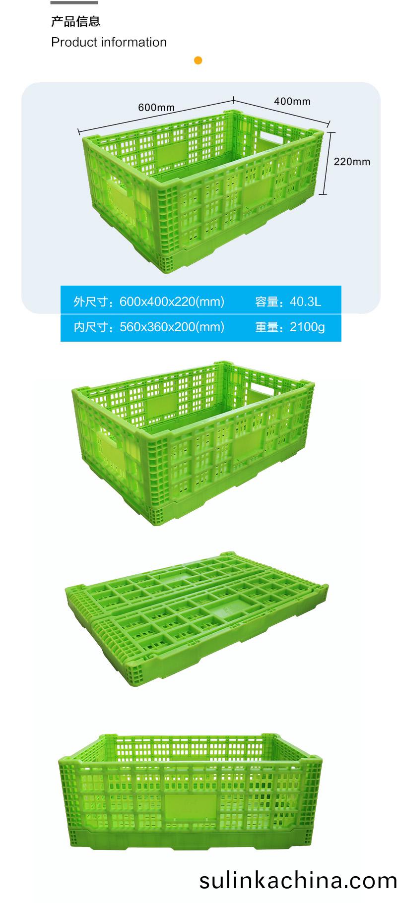 外尺寸:600*400*220mm 內(nei)尺寸:600*400*220mm 材質:PP 重量:2100g