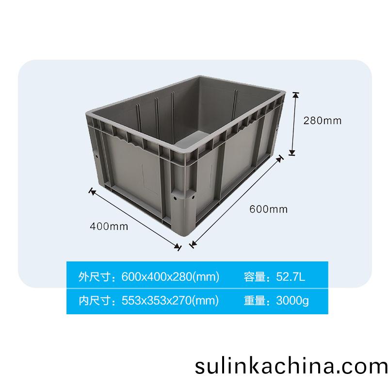 外尺寸:600*400*280mm 內尺寸(cun):553*353*270mm 材質:PP 重量:3000g