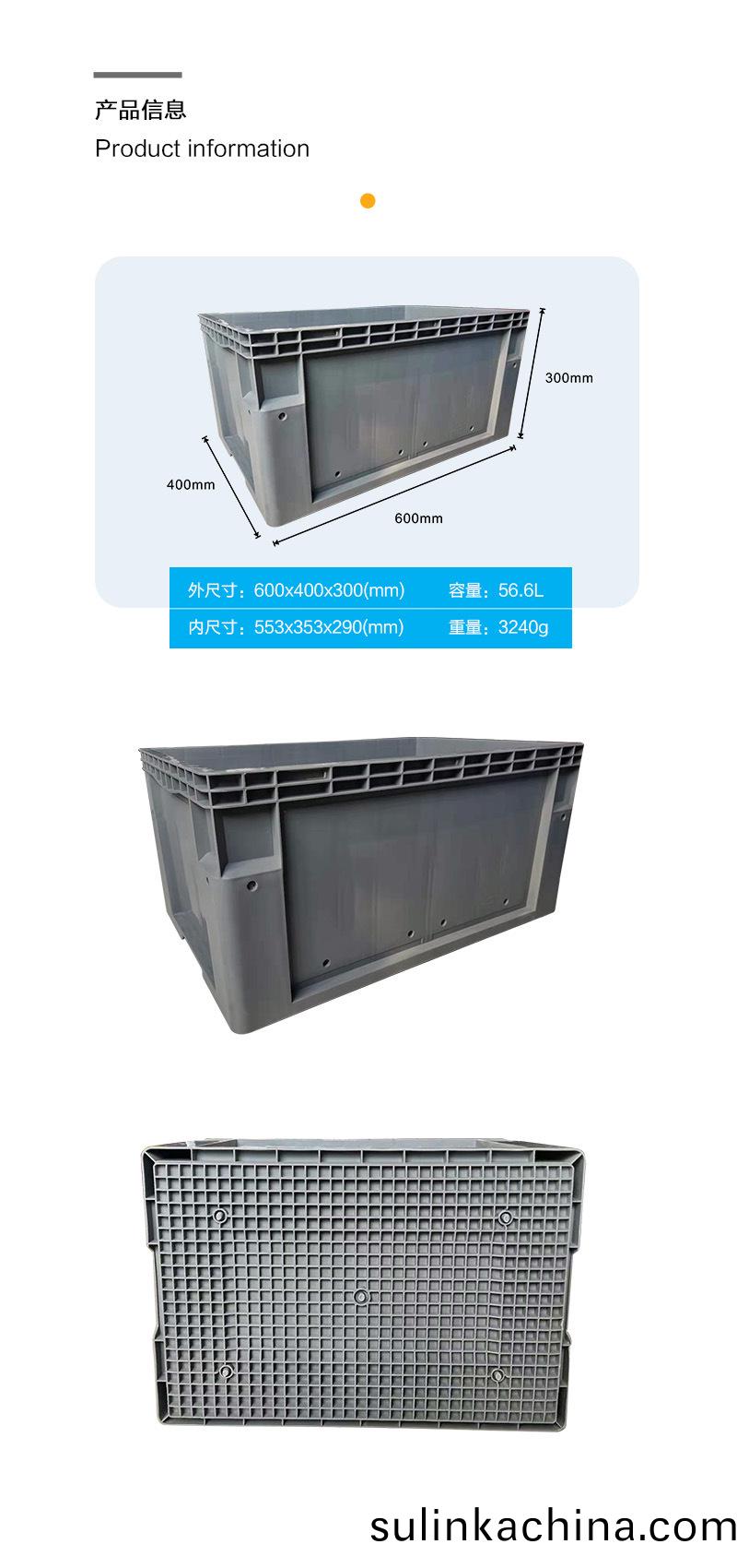 外尺寸:600*400*300mm 內尺寸:553*353*290mm 材質:PP 重量:3240g