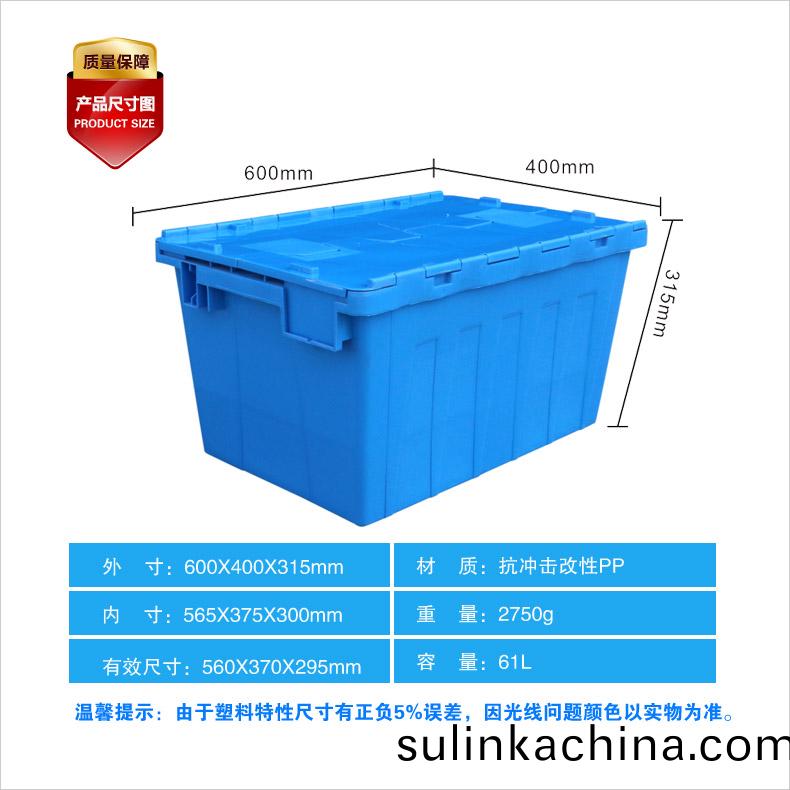 外尺寸:600×400×315mm 內尺寸(cun):568×375×300mm 材質:PP 重量:2750g