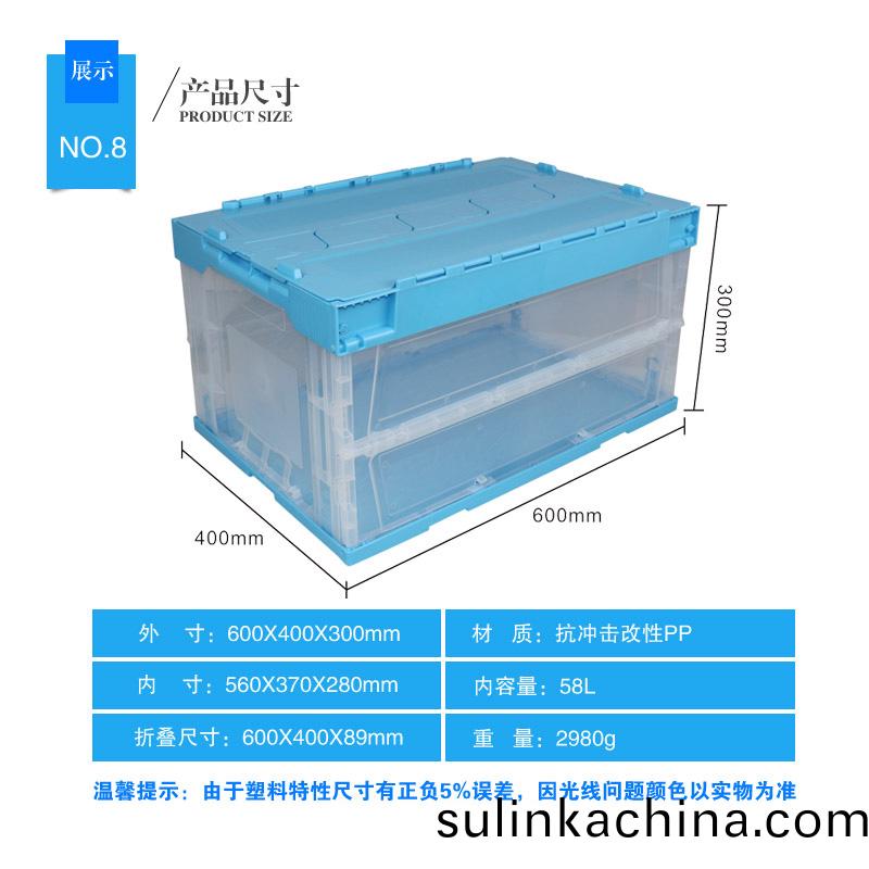 外尺寸:600×400×300mm 內尺寸:560×370×275mm 材(cai)質:PP 重量:3100g