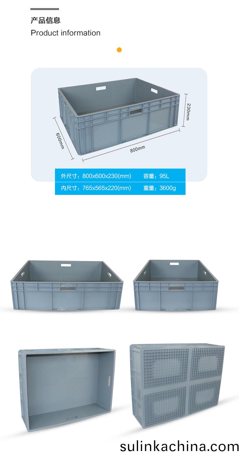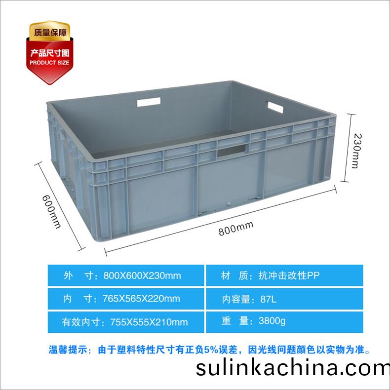 外尺寸:800*600*230mm 內尺(chi)寸:765*565*220mm 材質:PP 重量:3250g