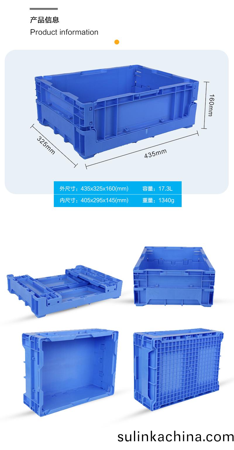 外尺寸:435*325*160mm 內尺寸:405*395*145mm 材(cai)質(zhi):PP 重量:1340g