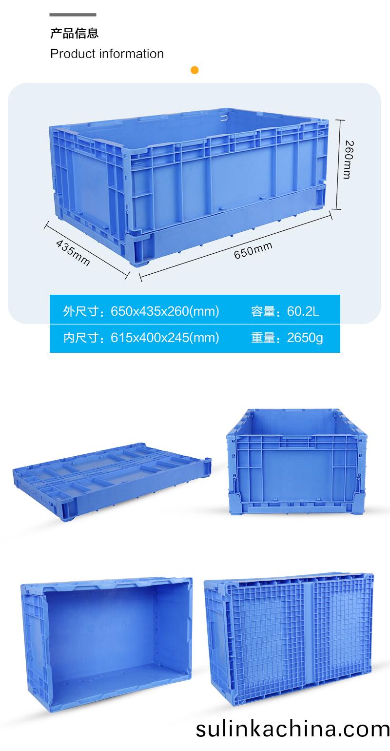 外尺寸(cun):650*435*260mm 內尺寸:615*400*245mm 材質:抗衝擊改性PP 重量:2650g