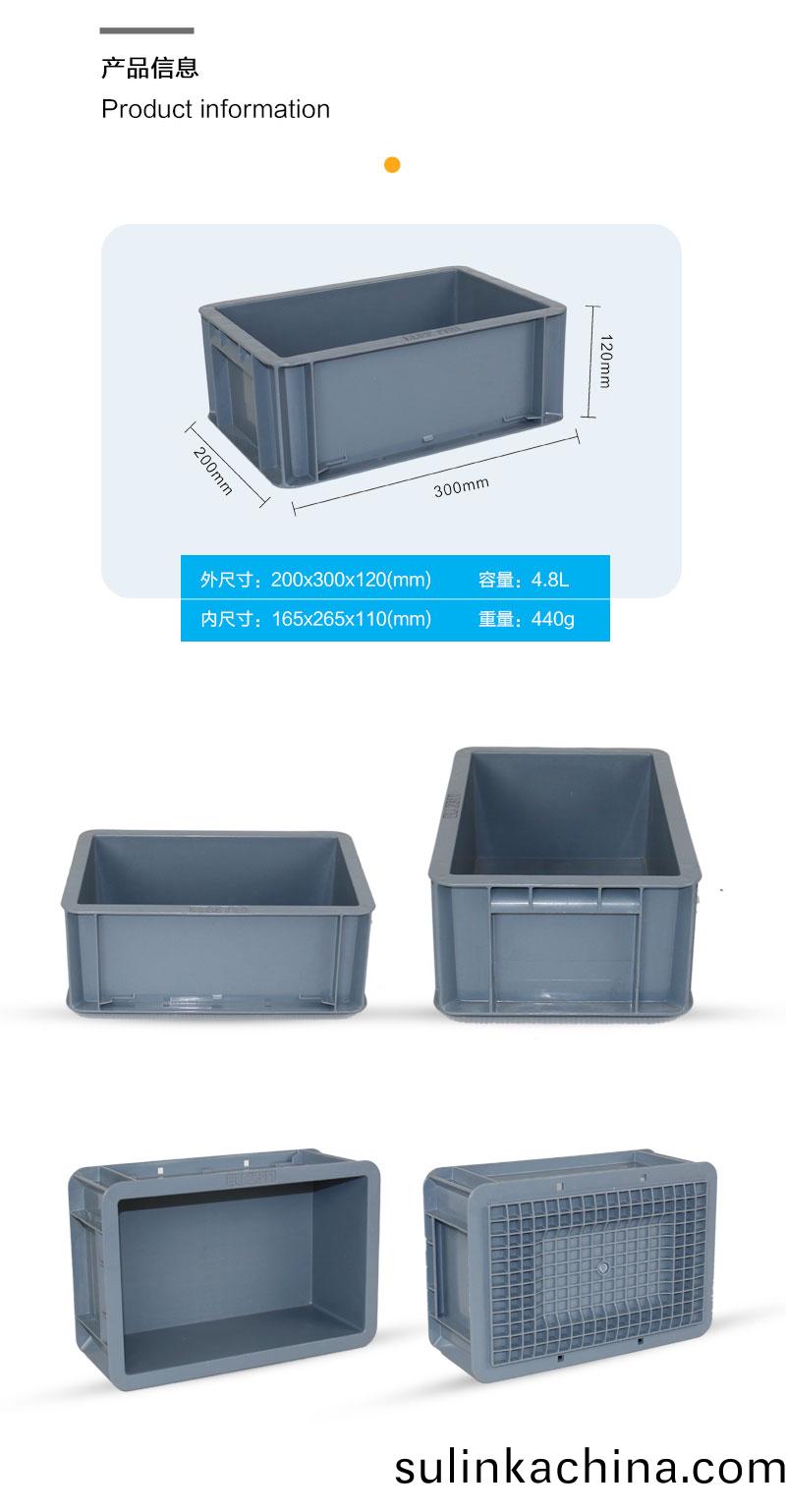 外尺寸:200*300*120mm 內尺寸:165*265*110mm 材質:抗衝擊改性(xing)PP 重量:455g