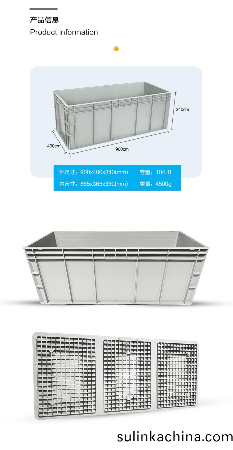 外尺寸(cun):900*400*340mm 內尺寸:865*365*330mm 材(cai)質:抗衝(chong)擊性改性PP 重量:4300g