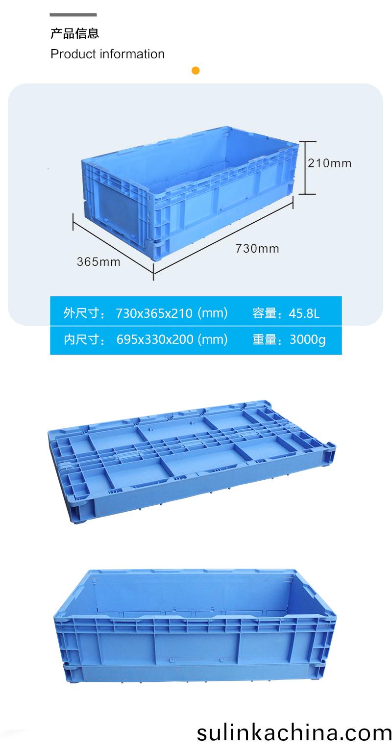 外尺寸:730*365*210mm 內尺寸:695*330*200mm 材(cai)質:PP 重(zhong)量:3000g