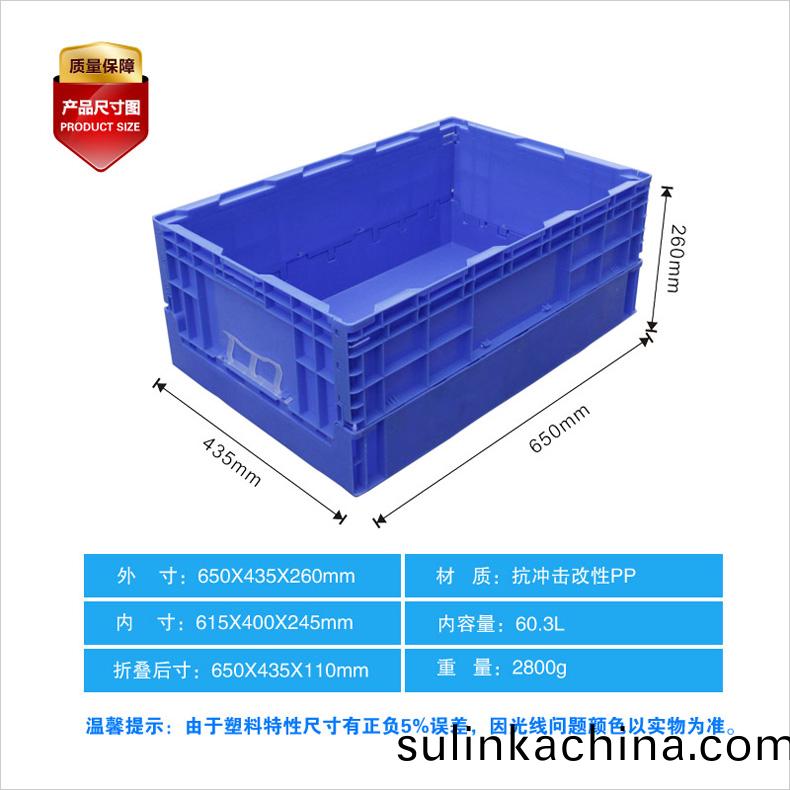 外尺(chi)寸:650*435*260mm 內尺寸:615*400*245mm 材質:抗衝擊改性PP 重量:2800g