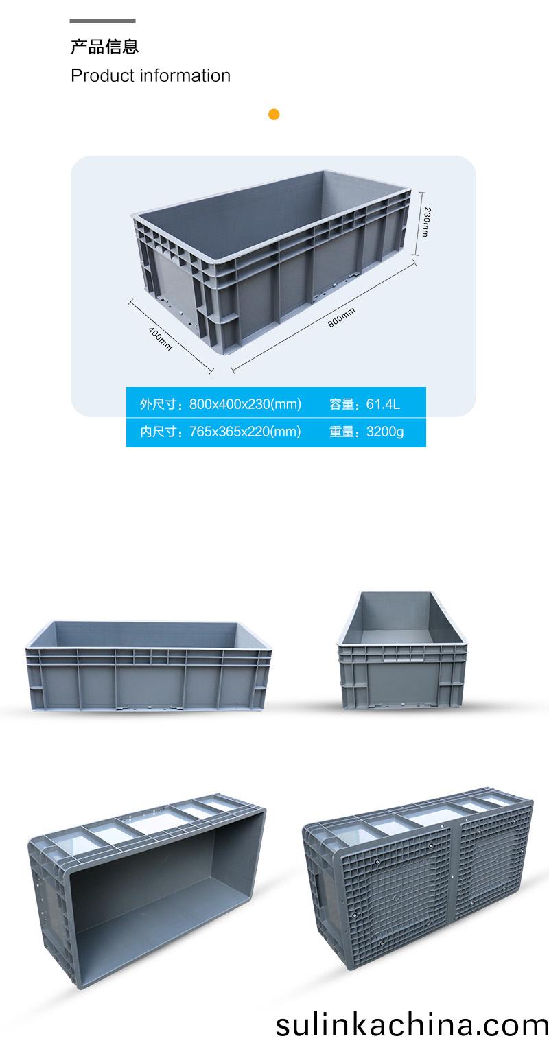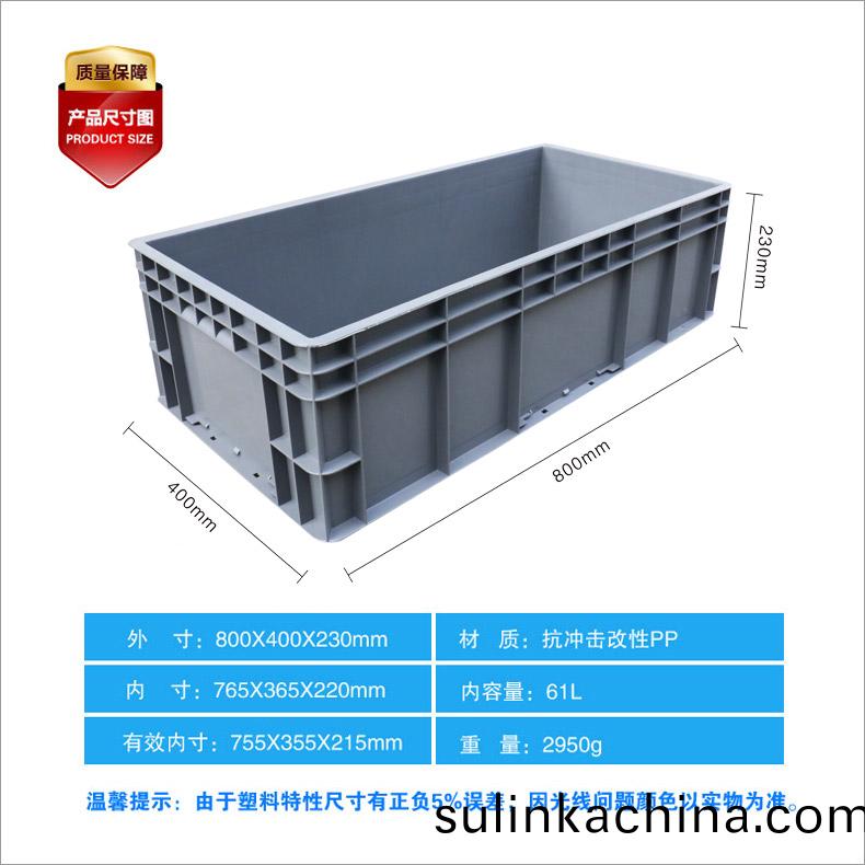 外尺寸:800X400X230mm 內尺寸:765X365X220mm 材質:抗衝擊改性PP 重量:2.9kg