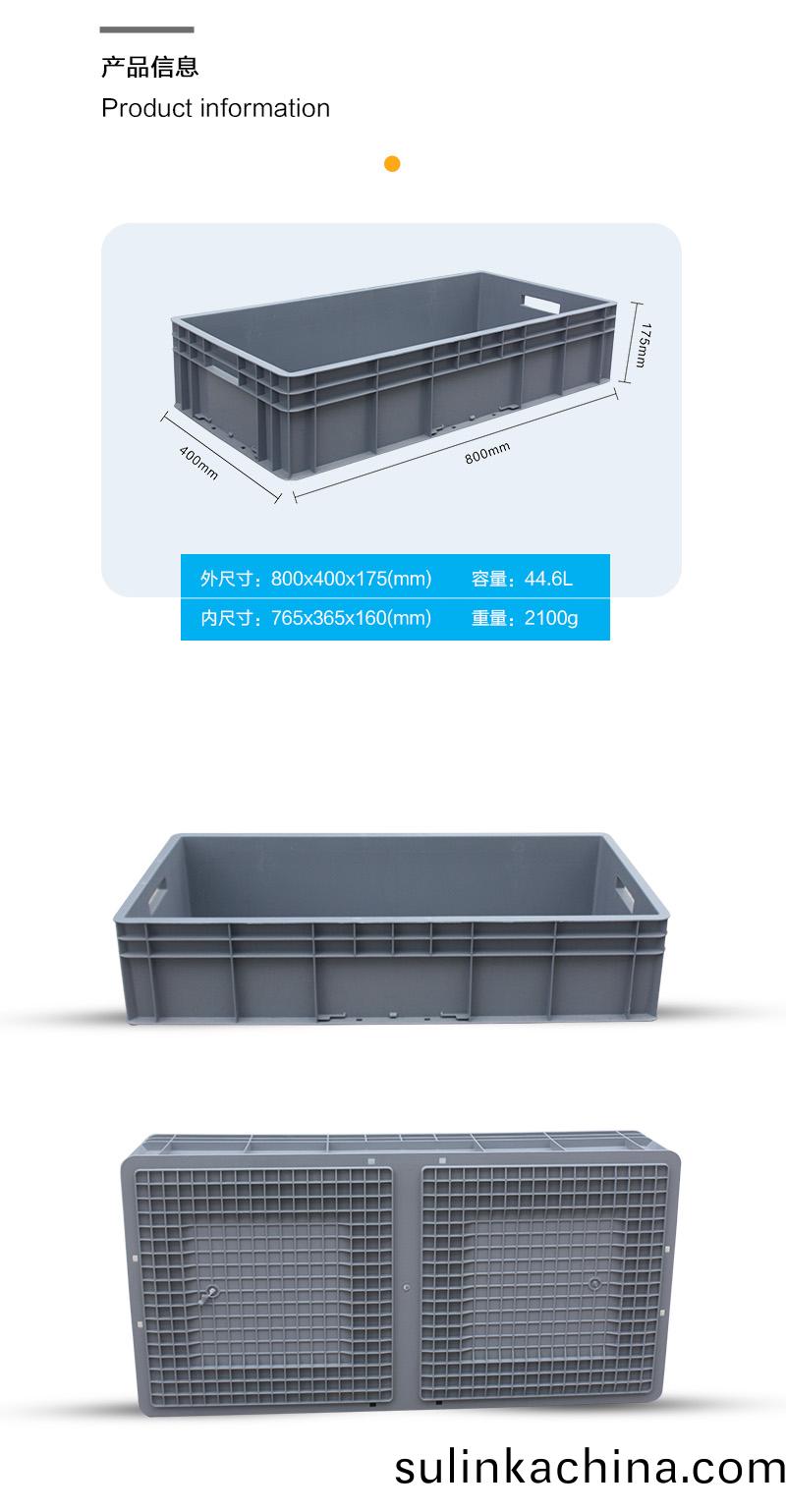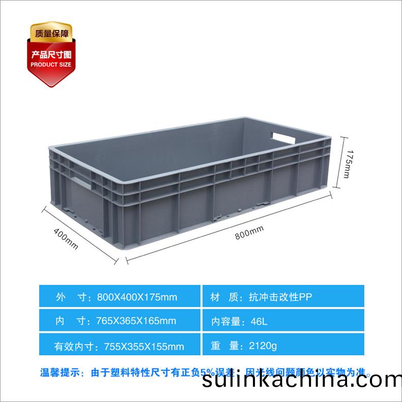 外尺寸:800X400X175mm 內(nei)尺寸:765X365X160mm 材質:抗衝擊改性PP 重量:2.05kg