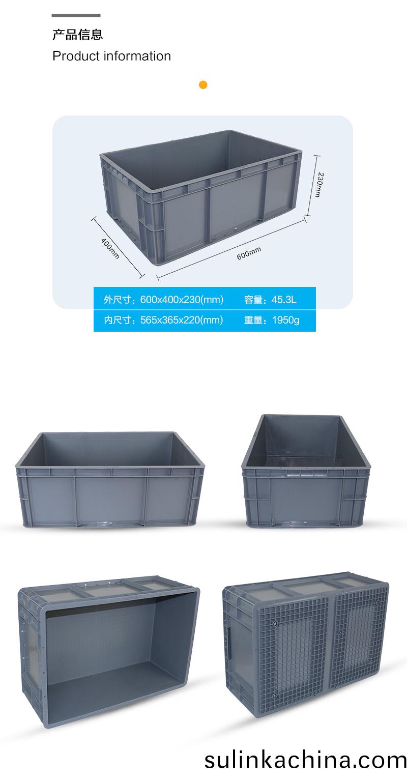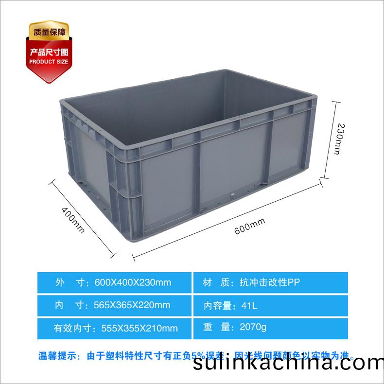 外尺寸:600X400X230mm 內尺寸:565X365X220mm 材質(zhi):抗衝擊改性PP 重量:1.9kg